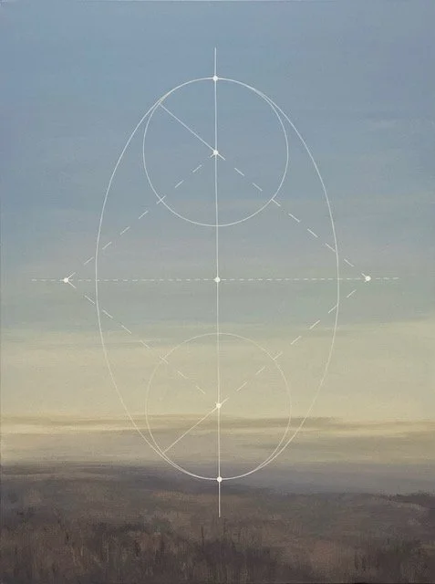 Naomi’s paintings, in oil and acrylic, begin with carefully observed skies rendered in a swift manner that reflects the fleeting nature of changing light. She then overlays geometric motifs borrowed from the fields of navigation, astronomy and surveying that suggest a twenty-first century alertness to western perspectives and constructs. These ‘atmoscapes’ highlight the western preoccupation of plotting, measuring and evaluating the potential utility of land, sea and skies to our own ends, overlooking the intrinsic wealth and fragility of nature itself. A layering of objective and subjective modes of seeing point to the human tradition of taking aesthetic gratification in the affective forces of nature, while simultaneously appraising its potential worth to our colonizing and consumptive tendencies.